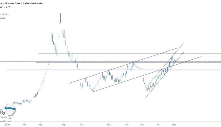 قیمت در تایم هفتگی به مقاومت رسیده و همچنین سقف کانال صعودی روی قیمت ۲۴۰۰۰ ریال و وارد اصلاح شده است