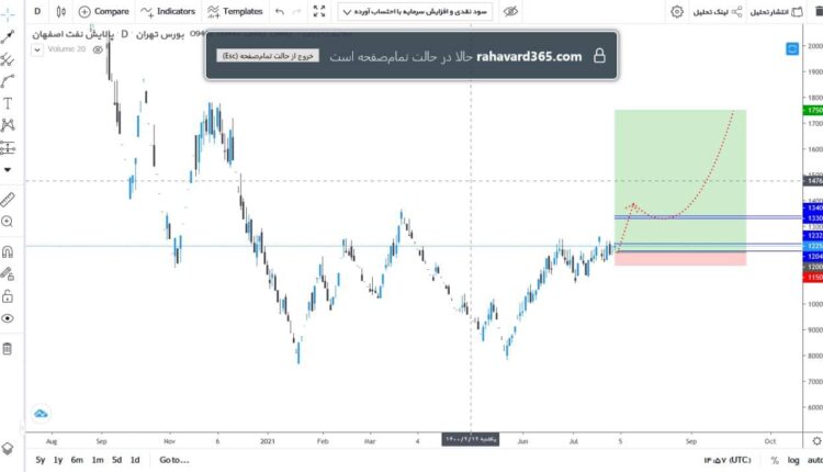 با تثبیت در بالای محدوده ی۱۳۰۰۰ ﷼ تا ۱۳۳۰۰ ﷼می توان به حجم خرید اضافه کرد البته توصیه می شود حتما هنگام رسیدن به این محدوده وضعیت چارت سهم مجدد بررسی و شرایط برای خروج یا اجازه دادن به رشد سود و یا اضافه کردن حجم سنجیده شود.