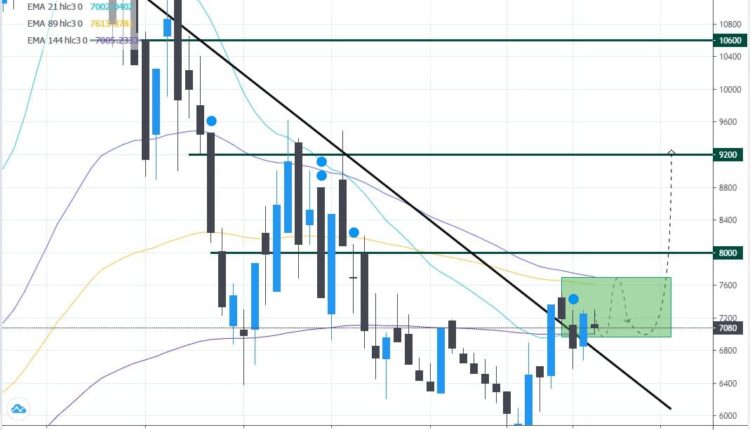 همچنین درگیر شکستن خط روند مهمی است و اکنون پس از شکستن آن به آن پولبک زده است. با توجه به آرایش قدرت نسبی خریداران به فروشندگان در تایم هفتگی همچنان انتظار بر این است که نهایتا این ناحیه را به سمت بالا بشکند. اهداف قیمتی پیشرو در تصویر با خط سبز رنگ در ۸۰۰ و ۹۲۰ و ۱۰۶۰ تومان مشخص شده ند.